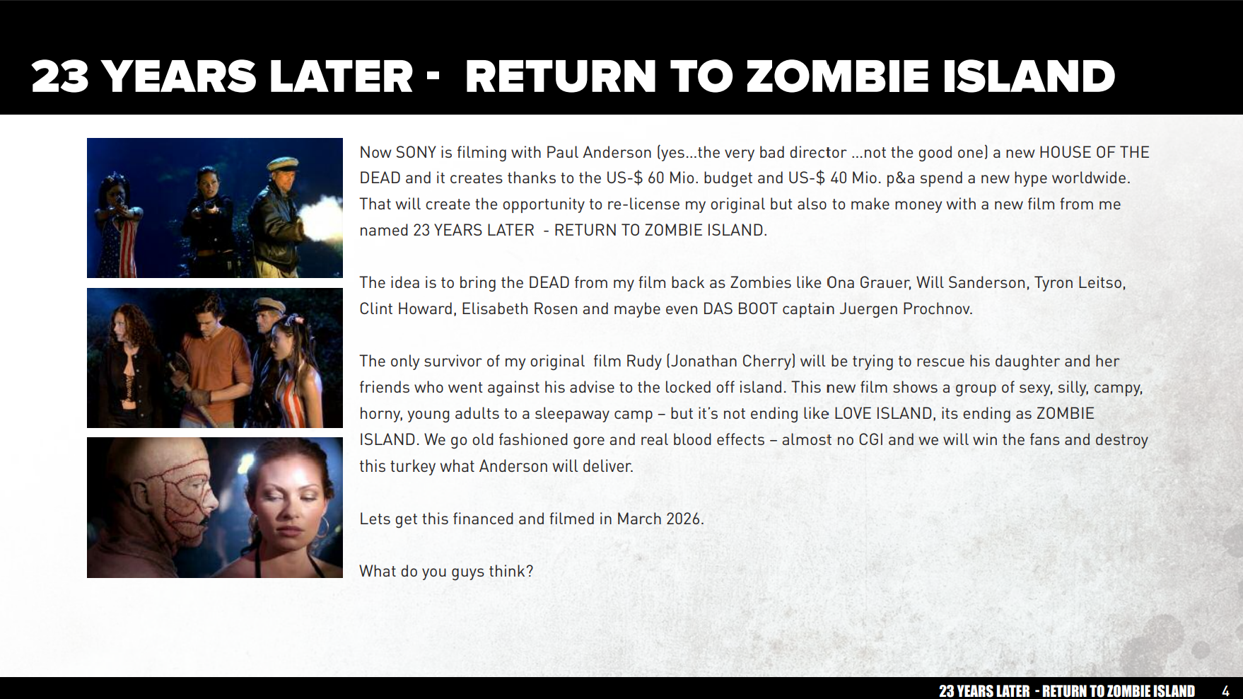 580 Euro: Sende uns Fotos von dir und wir erstellen einen KI-Avatar, der dich für 10 Sekunden in den Film einfügt als Zombie! Du wirst jemanden fressen oder wirst erschossen oder wirst explodieren! Nur du wirst diese Kopie des Films bekommen! Wie ein NFT Original. Ebenso von Uwe Boll und dem Cast signiert und du wirst im Abspann genannt!