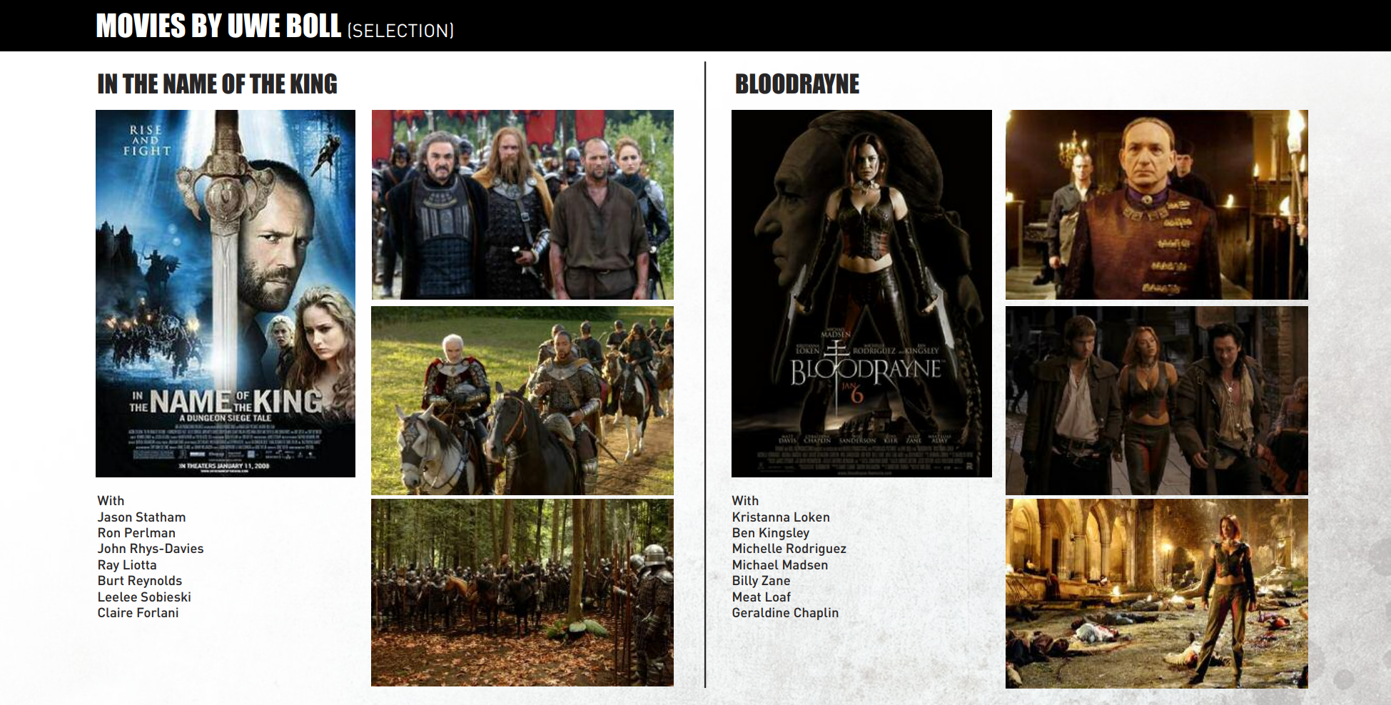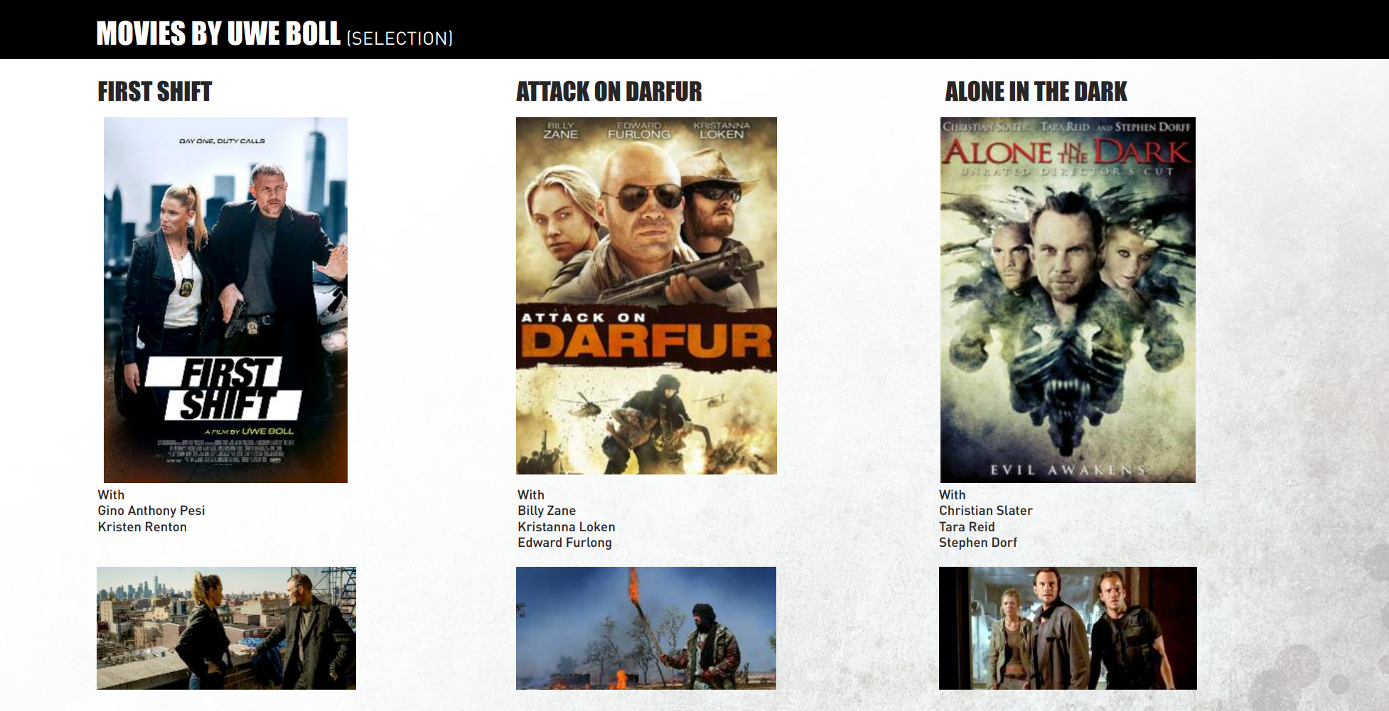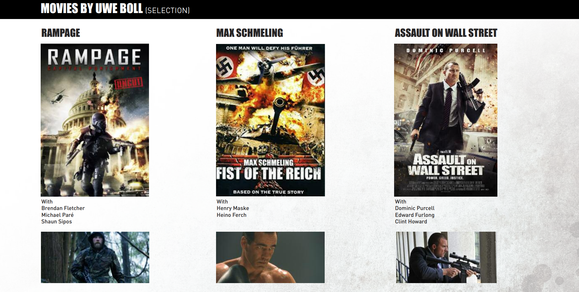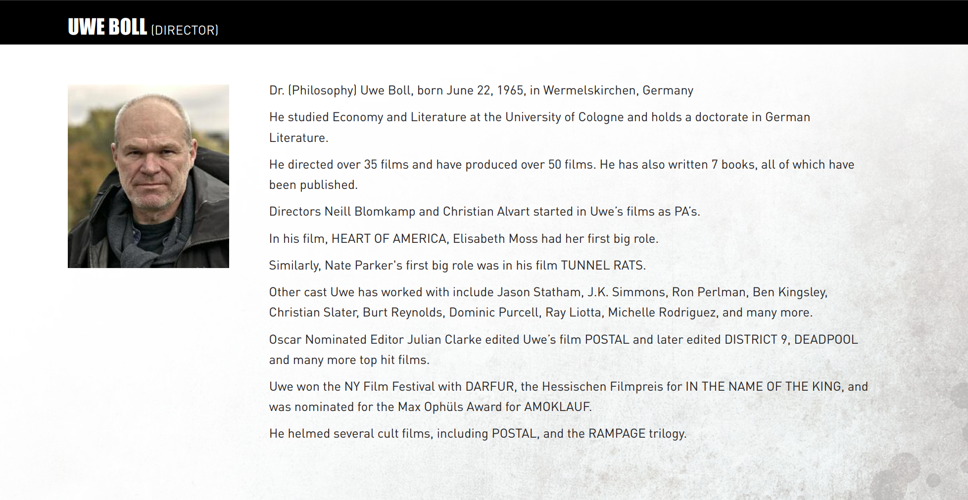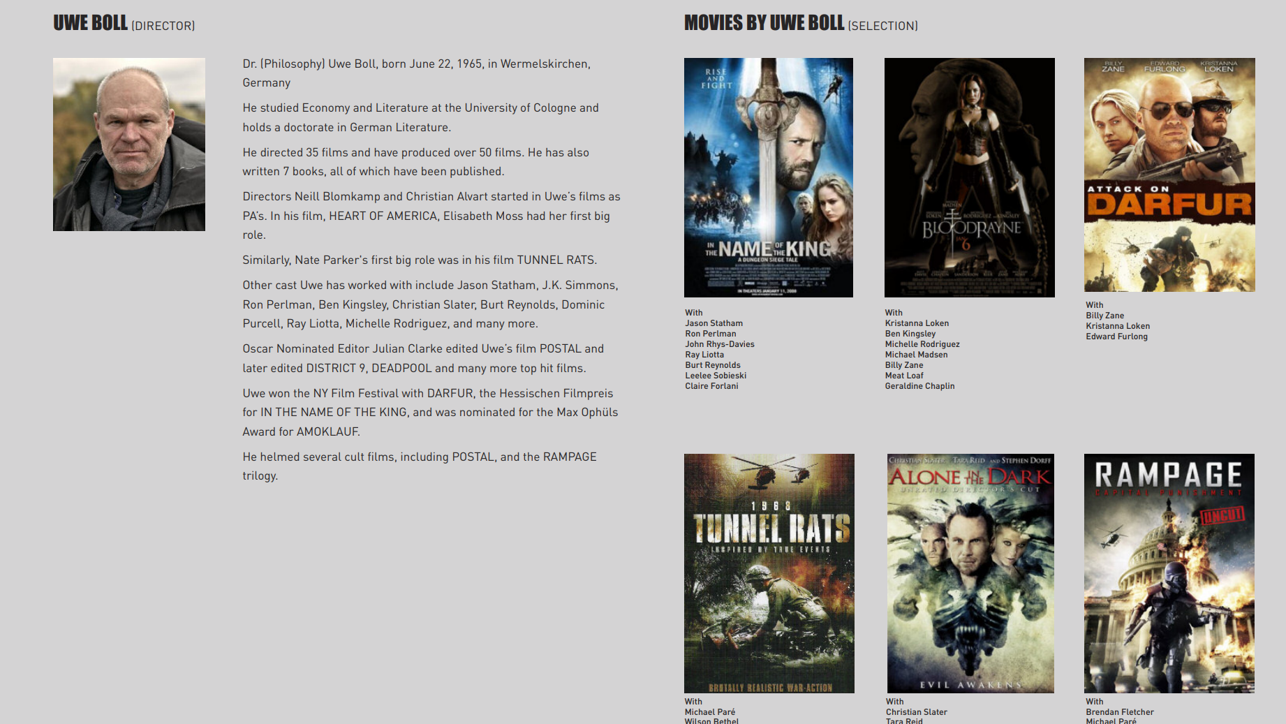 From 2010 on, Boll focused less on video game movies and more on politically or historically driven movies like “1968 – Tunnel Rats” about the Vietnam War, “Darfur” about the genocide in Sudan, “Assault on Wall Street” about the 2008 bailouts, “Stoic” about the jail system, and the trilogy “Rampage” about a domestic terrorist.